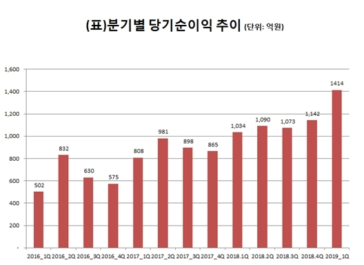 이는 전년 동기 대비 36.6%, 직전 분기 대비 23.8% 오른 수치다. 5분기 연속 1000억원대 당기순이익을 기록하기도 했다.