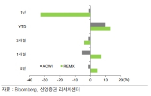 김남호 신영증권 연구원은 “글로벌시장에서 중국의 희토류 생산비중은 실질적으로 90% 이상”이라며 "2010년에도 일본과 중국간의 센카쿠 열도 갈등이 고조화되었을 당시 중국은 희토류의 수출을 중단한 과거 사례도 있다"고 말했다.