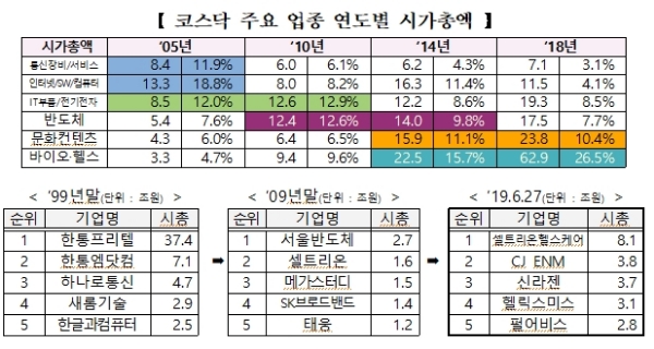 한국거래소 관계자는 “시가총액 상위업종이 제조업(통신장비·부품 등)에서 바이오, 4차산업 등 미래성장 산업중심으로 재편됐다”며 "코스닥시장은 23년 동안 선도업종과 기업육성에 기여하면서, 한국경제 패러다임 변화를 주도했다”고 말했다.