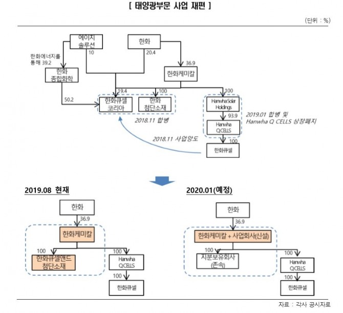 한화첨단소재는 태양광, 자동차 소재를 생산해왔고 한화큐셀코리아는 태양광 셀과 모듈을 생산, 판매해 왔다. 합병과정에서 계열 내 지분 거래에 따라 한화케미칼은 태양광 사업의 핵심 계열사의 지분을 100% 확보하게 된다. 한화큐셀앤드첨단소재는 신설 사업회사와 존속 지분보유회사로 인적 분할한 후 신설 사업 부문은 2020년 1월 한화케미칼에 합병될 계획이다.