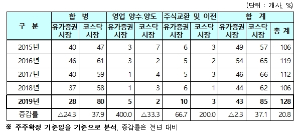 이미지 확대보기16일 한국예탁결제원에 따르면 지난해 상장법인 중 M&A를 완료했거나 진행 중인 회사는 전년 동기(106개사) 대비 20.8% 늘어난 128개사로 집계됐다.