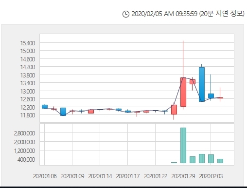 이미지 확대보기창해에탄올 주가는 29일 오전 9시 29분 현재 전거래일 대비 16.21% 오른 1만4700원에 거래되고 있다. 자료=한국거래소 신종 코로나 바이러스 확산으로 손소독제 수요가 급증하며 에탄올관련주가 강세를 나타내고 있다.