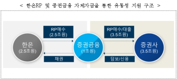 한국증권금융은 25일에 한은RP로 조달한 자금(2조5000억 원)뿐만 아니라 증권금융 자체자금(1조 원)을 재원으로 환매조건부채권(RP) 5000억 원, 증권담보대출 1조 8000억 원, 할인어음 증액 1조 2000억 원 등 총 3조5000억 원을 우선투입했다.