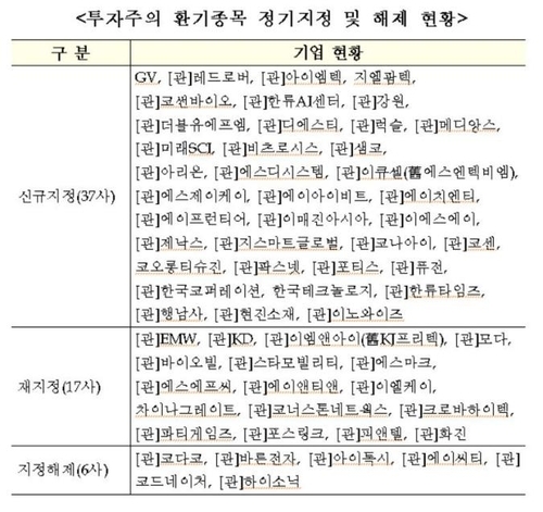 GV, 레드로버, 아이엠텍, 지엘팜텍 등 37개 종목은 신규 지정됐고, EMW, KD, 모다, 바이오빌 등 17개 종목은 재지정됐다.