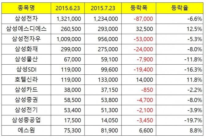 이 부회장이 사과를 한 후 한달 간의 삼성 계열사 주가는 대체로 하락했다.