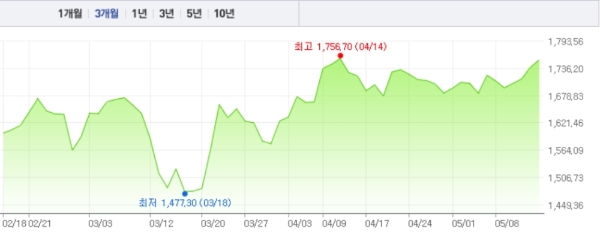 장중 한때 전장 대비 1.97% 상승한 7만원까지 오르며 장중 최고가를 갈아치웠다. 종전 장중 최고가는 지난달 27일 기록한 6만8890원이다.