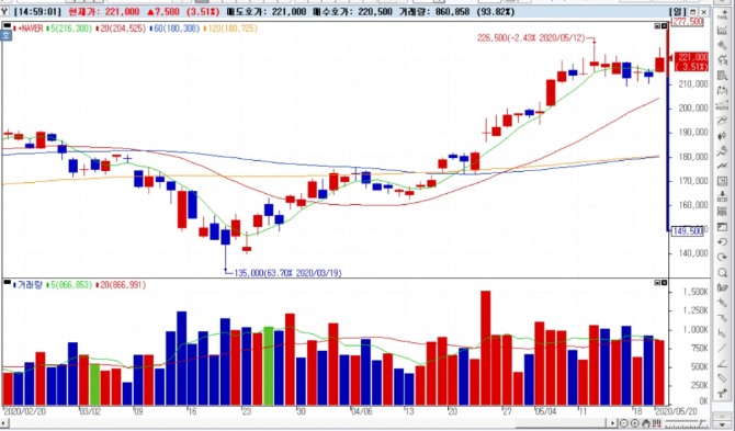 이미지 확대보기20일 오후 2시 50분 현재 증시에서 네이버와 카카오는 각각 3.75% 와 5.68% 상승중이다.