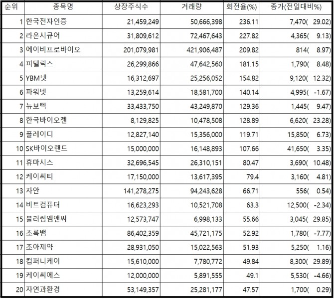 지난 20일 코스닥에서 회전율이 높은 상위 20 종목은 다음과 같다.