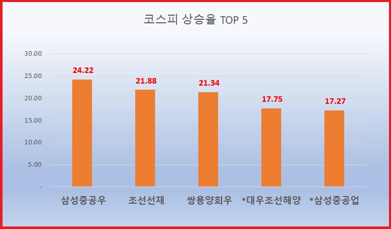 21위 샘표식품, 46300원 ( 6.59% ) , 22위*현대미포조선, 34600원 ( 6.5% ) , 23위 STX중공업, 2540원 ( 6.1% ) , 24위*현대중공업지주, 281000원 ( 6.23% ) , 25위 KODEX 기계장비, 3645원 ( 6.04% ) , 26위 엔케이, 922원 ( 5.86% ) , 27위 케이씨씨글라스, 33050원 ( 5.45% ) , 28위 현대비앤지스틸우, 51200원 ( 5.27% ) , 29위 풀무원, 15650원 ( 5.11% ) , 30위 QV 레버리지 WTI원유 선물 ETN(H), 295원 ( 5.08% )