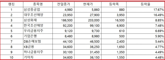 오후 2시 현재 시가총액 상위 100위 종목을 대상으로 상승률 상위 종목 10종목을 분석한 결과 1위와 2위를 포함해 총 3종목이 조선업종이다.