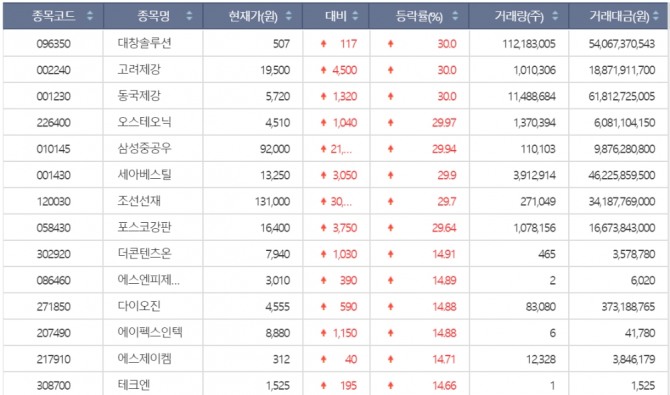 대창솔루션 동국제강 삼성전자(+6.03%) SK하이닉스(6.48%)를 비롯해 신한지주(+11.72%) 우리금융지주(6.70%) 등 일부 금융지주 회사들이 급등했다.