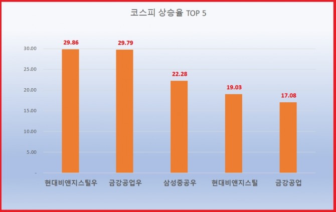 1위 현대비앤지스틸우, 58600원 ( 29.86% ) , 2위 금강공업우, 9400원 ( 29.79% ) , 3위 삼성중공우, 92000원 ( 22.28% ) , 4위 현대비앤지스틸, 8040원 ( 19.03% ) , 5위 금강공업, 3425원 ( 17.08% ) , 6위 모나미, 4645원 ( 15.82% ) , 7위 현대건설우, 113000원 ( 14.6% ) , 8위 신성통상, 1450원 ( 14.14% ) , 9위*동국제강, 5720원 ( 13.11% ) , 10위 드림텍, 6650원 ( 12.78% )