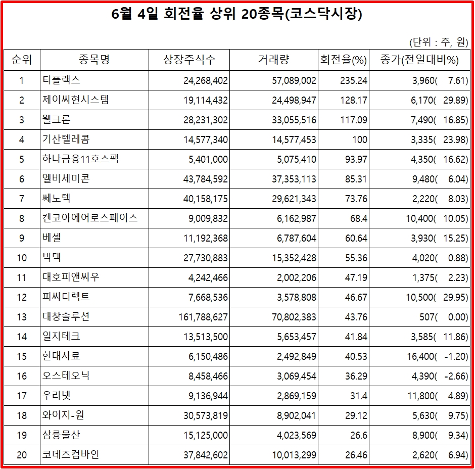 이미지 확대보기지난 4일 코스닥 회전율 기준 상위 20종목은 다음과 같다.