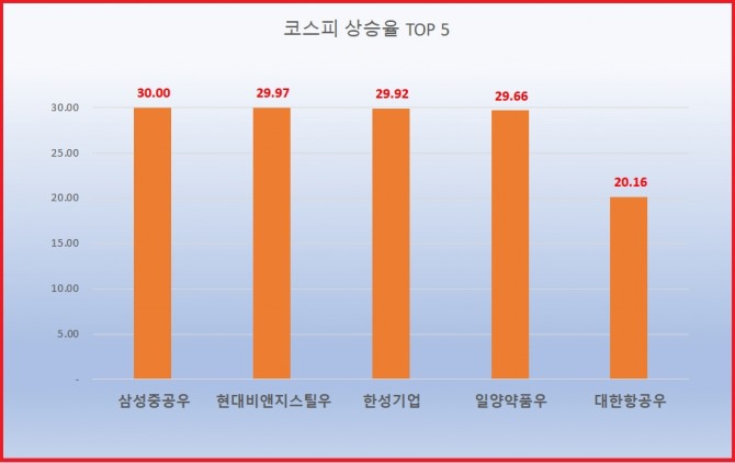 1위 삼성중공우, 155000원 ( 30% ) , 2위 현대비앤지스틸우, 76400원 ( 29.97% ) , 3위 한성기업, 5280원 ( 29.92% ) , 4위 일양약품우, 39950원 ( 29.66% ) , 5위 대한항공우, 18350원 ( 20.16% ) , 6위*쌍용차, 1925원 ( 19.48% ) , 7위 포스코강판, 15800원 ( 18.99% ) , 8위 화인베스틸, 2555원 ( 17.22% ) , 9위*일양약품, 61000원 ( 16.72% ) , 10위 현대비앤지스틸, 8420원 ( 11.76% )