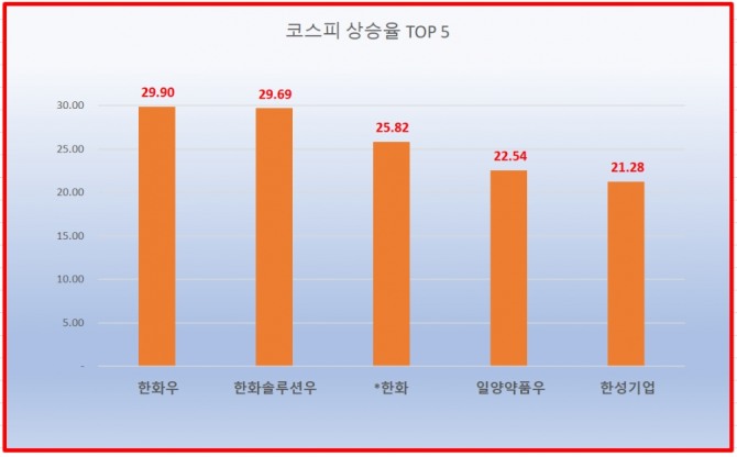 1위 한화우, 29600원 ( 29.9% ) , 2위 한화솔루션우, 11450원 ( 29.69% ) , 3위*한화, 22850원 ( 25.82% ) , 4위 일양약품우, 51900원 ( 22.54% ) , 5위 한성기업, 6860원 ( 21.28% ) , 6위 현대비앤지스틸우, 99300원 ( 22.36% ) , 7위 현대건설우, 130000원 ( 20% ) , 8위 유한양행우, 67700원 ( 18.91% ) , 9위 SK네트웍스우, 98500원 ( 18.27% ) , 10위 한화3우B, 11700원 ( 16.67% )
