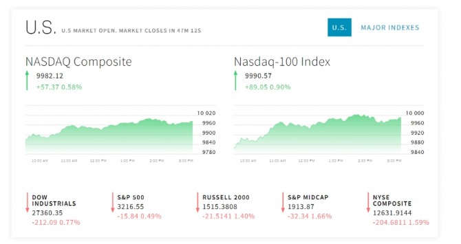 10일 미국 뉴욕증시에 따르면 나스닥지수가 연이틀 최고치 행진을 이어가면서 처음으로 1만선을 뚫었다. 나스닥은 이후 다시 하락반전해 지금은 1만선 아래로 떨어졌다.