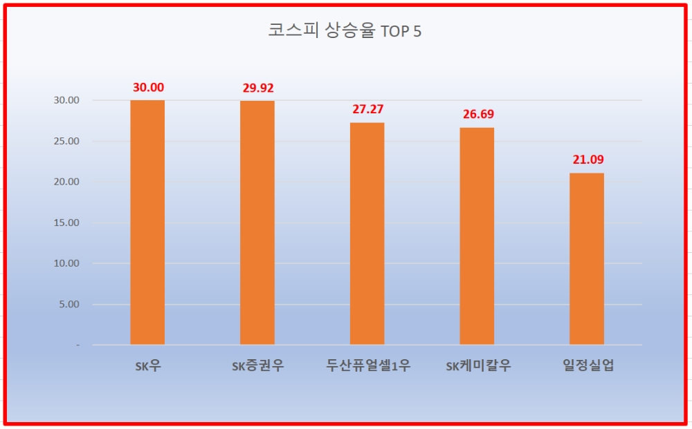 1위 SK우, 370500원 ( 30% ) , 2위 SK증권우, 4125원 ( 29.92% ) , 3위 두산퓨얼셀1우, 13300원 ( 27.27% ) , 4위 SK케미칼우, 71200원 ( 26.69% ) , 5위 일정실업, 15500원 ( 21.09% ) , 6위 SK증권, 793원 ( 21.25% ) , 7위 SK디스커버리우, 28500원 ( 23.64% ) , 8위 삼성중공우, 403500원 ( 18.85% ) , 9위 두산퓨얼셀2우B, 33400원 ( 20.8% ) , 10위 두산솔루스1우, 25750원 ( 13.94% )