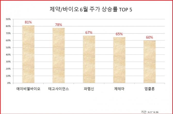 이달 1일부터 16일까지 제약, 바이오, 의료기기 업종의 주가 등락률을 비교 분석한 결과 에이비엘바이오는 81.42% 상승했고, 뒤를 이어 테고사이언스가 77.75% 상승해 각각 상승률 1위와 2위를 달리고 있다.