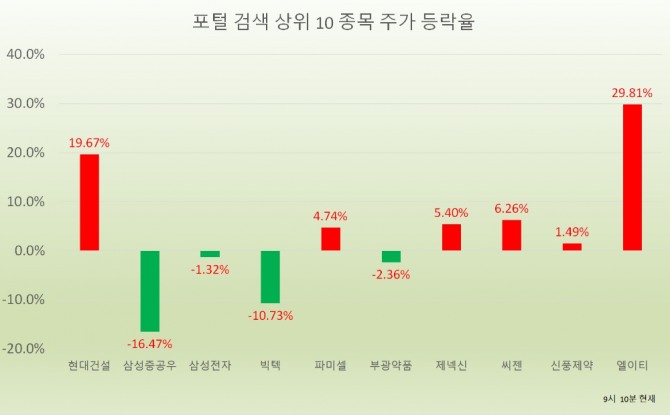 표기 순서는 포털사 기준 검색 상위 랭킹, 종목명, 현재가, 주가 등락률 순이다.