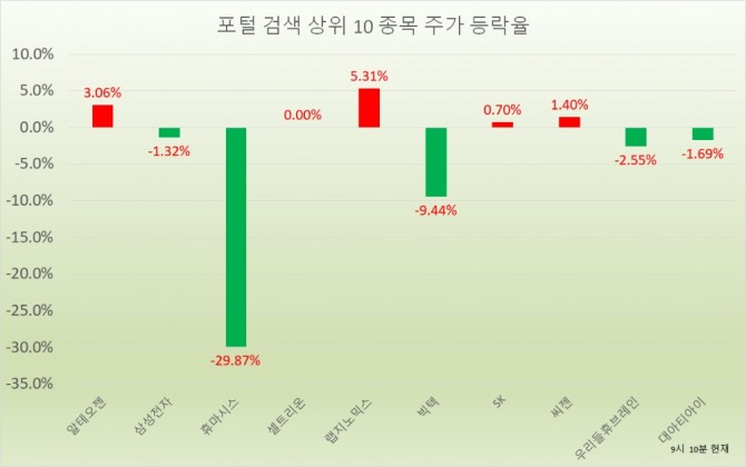 25일 오전 9시 10분 현재 포털사가 집계하는 검색량 기준 상위 20개 종목의 현황은 다음과 같다.