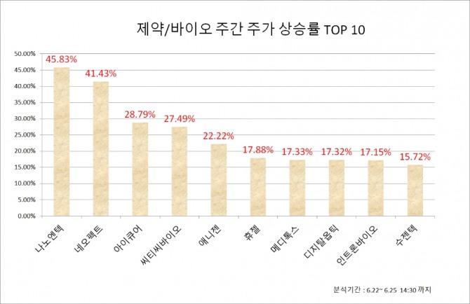 JW생명과학 (8.76%), 코아스템 (8.38%), 펩트론 (8.33%), 셀트리온 (8.23%), 마이크로프랜드 (7.88%), 올리패스 (7.72%), 제노레이 (7.26%), 아스타 (7.13%), 엘앤씨바이오 (6.73%), 일양약품 (6.63%), 테고사이언스 (6.52%), 대원제약 (6.02%), 아이센스 (5.57%),