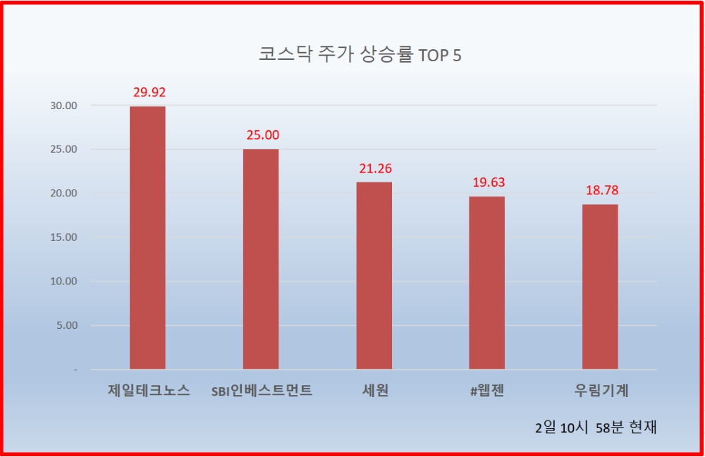 1위 제일테크노스 5450원 ( 29.92% ), 2위 SBI인베스트먼트 710원 ( 25% ), 3위 세원 6160원 ( 21.26% ), 4위#웹젠 28950원 ( 19.63% ), 5위 우림기계 3225원 ( 18.78% ), 6위 지니뮤직 3545원 ( 16.23% ), 7위 대성미생물 16350원 ( 11.6% ), 8위 젬백스 21600원 ( 11.34% ), 9위 액션스퀘어 1585원 ( 11.23% ), 10위 리더스코스메틱 3940원 ( 10.52% ),