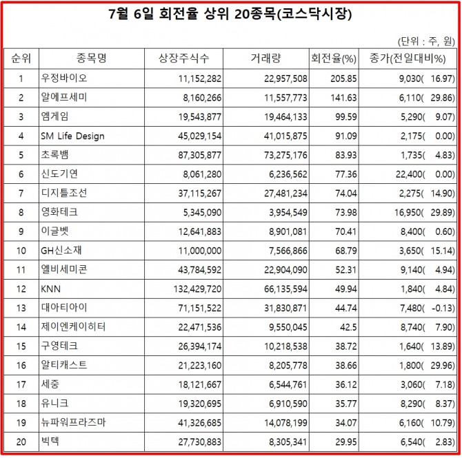 6일 증권시장에서 코스닥 종목의 거래량 회전율 기준 상위 종목은 다음과 같다.