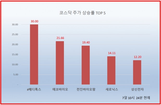 1위#메디톡스 215800원 ( 30% ), 2위 에코바이오 9100원 ( 21.66% ), 3위 전진바이오팜 6340원 ( 19.4% ), 4위 새로닉스 4205원 ( 14.11% ), 5위 상신전자 3265원 ( 12.2% ), 6위 크리스탈신소재 1860원 ( 12.05% ), 7위 모헨즈 4940원 ( 12.53% ), 8위 파멥신 24700원 ( 12.27% ), 9위 빅텍 7130원 ( 9.02% ), 10위#엘앤에프 39550원 ( 10.47% ),
