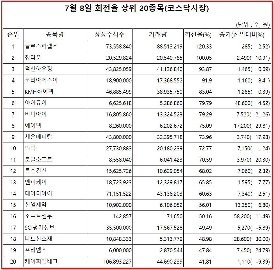 8일 증권시장에서 코스닥 종목의 거래량 회전율 기준 상위 종목은 다음과 같다.