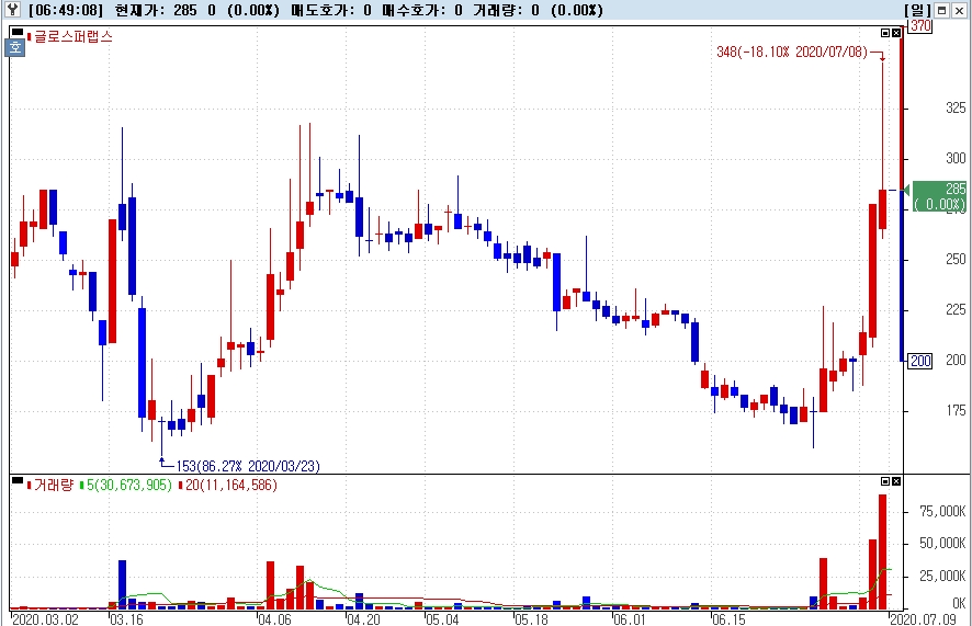 이미지 확대보기글로스퍼랩스는 상장주식수보다 1.2배 많은 거래량을 보이며 2.52% 상승한 285원으로 장을 마쳤다.