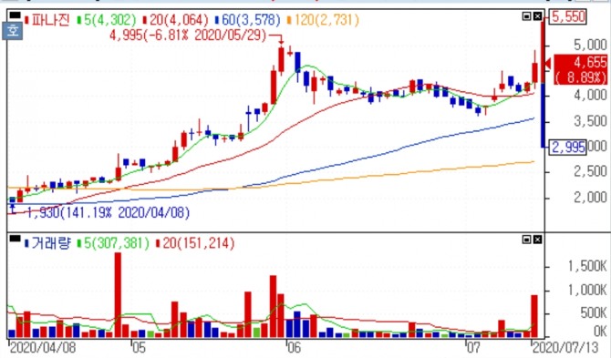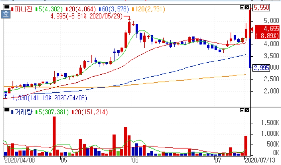 이미지 확대보기파나진은 13일 오후 1시 32분 현재 전일대비 7.13% 상승하며 4580원에 거래되고 있다.