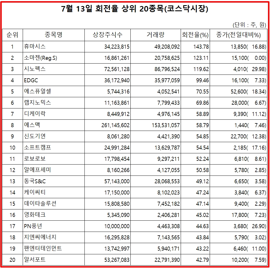 이미지 확대보기13일 증권시장에서 코스닥 종목의 거래량 회전율 기준 상위 종목은 다음과 같다.
