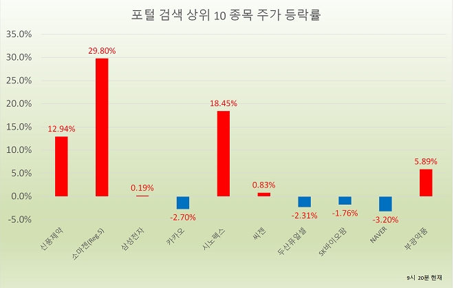 오전 9시 20분 현재 포털사가 집계하는 검색량 기준 상위 20개 종목의 현황은 다음과 같다.