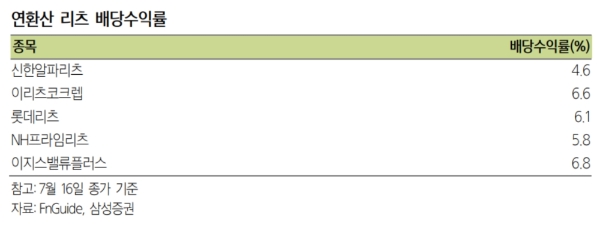 이경자 삼성증권 연구원은 "주요 상장리츠 5개의 연환산 평균 배당수익률은 연초 연5%대에서 현재 연6.1%로 상승했다"며 "저금리 시대에 자산 증대를 통한 배당 성장이라는 리츠투자매력이 부각될 것"이라고 내다봤다.