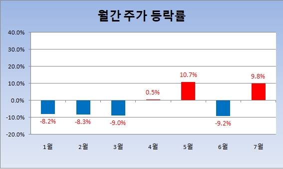 지난 5월 중에는 10.7%상승했고, 6월 중에는 9.2% 하락했다.