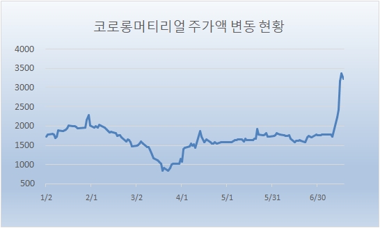 코오롱머티리얼은 지난 17일 전일대비 4.59% 하락한 3225원에 장을 마감했지만, 한주간 주가가 무려 86.4% 상승했다.