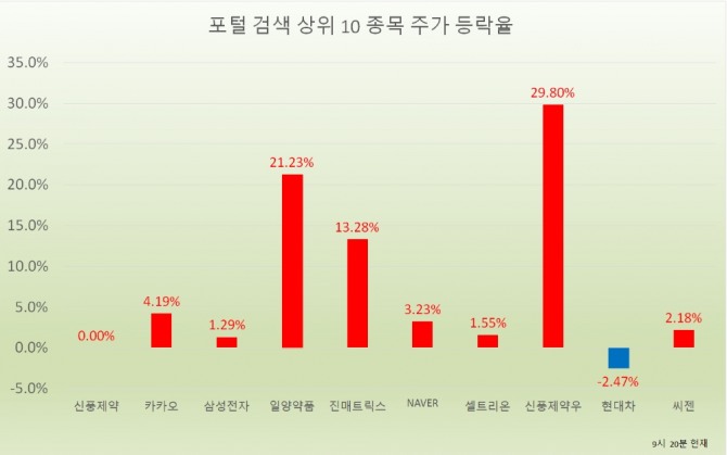 오전 9시 20분 현재 포털사가 집계하는 검색량 기준 상위 20개 종목의 현황은 다음과 같다.