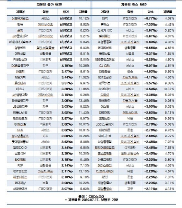 반면 신세계I&C, SBS콘텐츠허브, CJ CGV, 메가스터디 등 코로나로 타격을 받은 서비스 업종의 지분은 낮춘 것으로 나타났다.