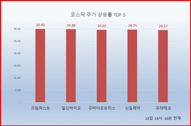 1위 프럼파스트 4940원 ( 30% ), 2위 일신바이오 3325원 ( 29.88% ), 3위 유바이오로직스 11500원 ( 29.65% ), 4위 신일제약 44700원 ( 29.75% ), 5위 유라테크 12050원 ( 29.57% ), 6위 오상자이엘 11700원 ( 27.73% ), 7위 에코캡 3155원 ( 24.95% ), 8위 에스티아이 20750원 ( 21.7% ), 9위 대주산업 1660원 ( 20.29% ), 10위 태웅 12750원 ( 19.72% ),