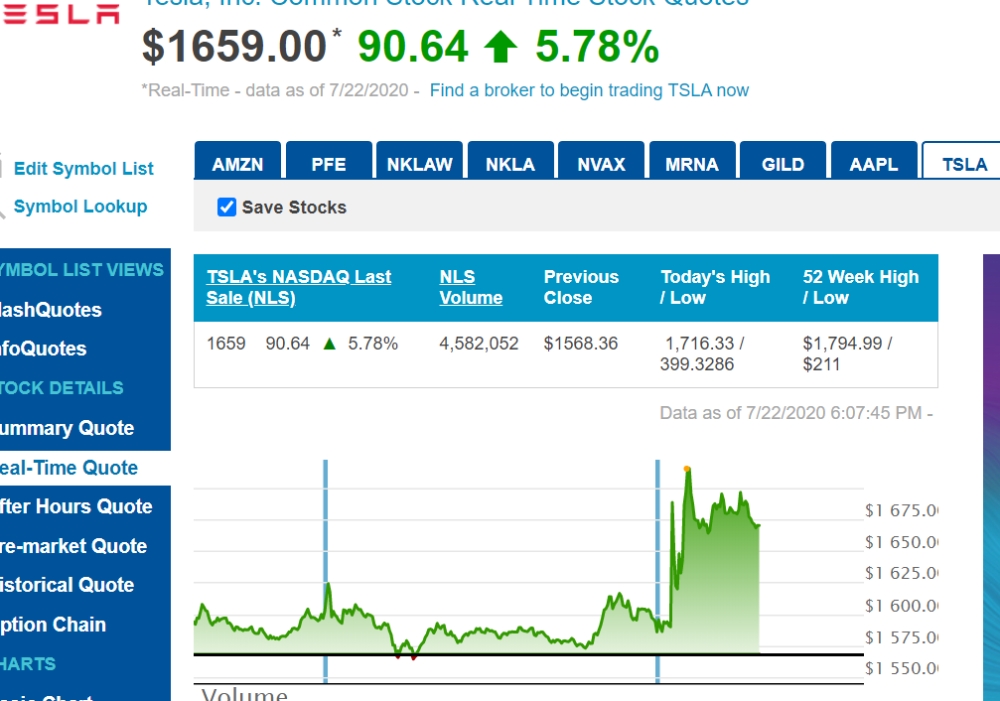 Tesla, Inc. Common Stock Real Time Stock Quotes= $1659.00* 90.64 5.78%