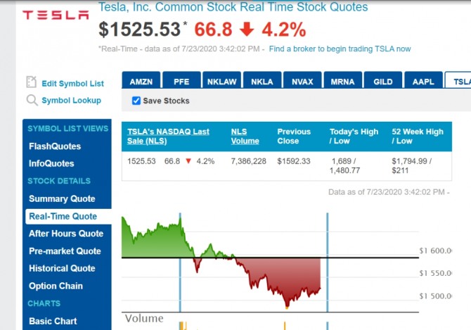 24일 뉴욕증시에 따르면 테슬라 주가는 전일대비 4.8% 떨어져 있다. 코로나 백신으로 제약바이오주 돌풍을 일으민 화이자와 모더나도 부진하다. 애플 구글 아마존 페이스북 넷풀릭스등이 동반 급락하는 모습이다.