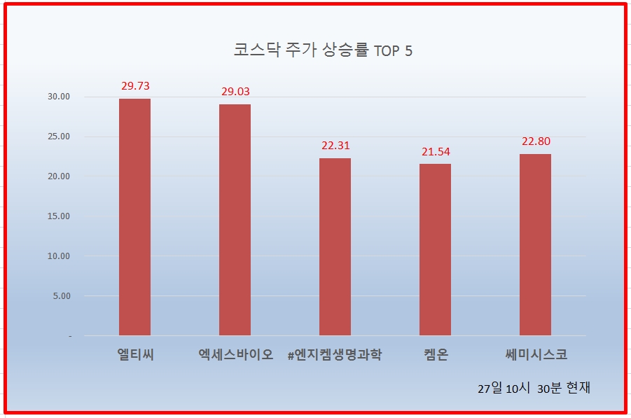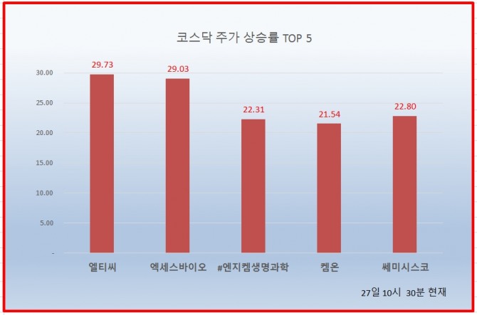 27일 10시 30분 현재 코스닥 상승률 상위 50개 종목은 다음과 같다.