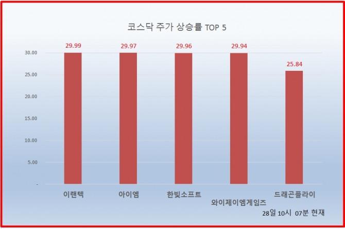1위 이랜텍 5440원 ( 29.99% ), 2위 아이엠 954원 ( 29.97% ), 3위 한빛소프트 3665원 ( 29.96% ), 4위 와이제이엠게임즈 2170원 ( 29.94% ), 5위 드래곤플라이 3555원 ( 25.84% ), 6위 한국큐빅 3420원 ( 22.58% ), 7위#제넥신 139100원 ( 20.22% ), 8위 엑세스바이오 6030원 ( 19.88% ), 9위 팅크웨어 11250원 ( 18.92% ), 10위 엠게임 6460원 ( 17.45% ),