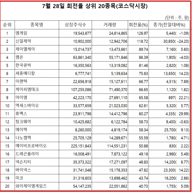 28일 증권시장에서 코스닥 종목의 거래량 회전율 기준 상위 종목은 다음과 같다.