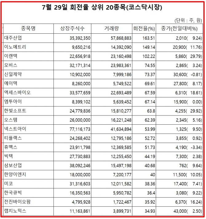 29일 증권시장에서 코스닥 종목의 거래량 회전율 기준 상위 종목은 다음과 같다.