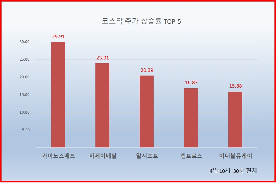 1위 카이노스메드 5950원 ( 29.91% ), 2위 피제이메탈 2565원 ( 23.91% ), 3위 알서포트 11750원 ( 20.39% ), 4위 켐트로스 6860원 ( 16.87% ), 5위 이더블유케이 5910원 ( 15.88% ), 6위 유니셈 7550원 ( 14.05% ), 7위 유바이오로직스 30700원 ( 13.08% ), 8위 화일약품 14450원 ( 12.89% ), 9위 넥슨지티 21300원 ( 12.11% ), 10위 시노펙스 6180원 ( 12.36% ),