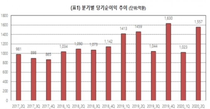 이미지 확대보기2018년 1분기부터 2020년 2분기까지 10개 분기 연속 1000억 원대 당기순이익을 달성했다. 연결기준 연환산 자기자본이익률(ROE)은 12.3%를 기록해 올해 1분기 10.2%포인트 대비 2.1%포인트 상승하며 꾸준히 두 자릿수 자기자본이익률(ROE)를 유지하고 있다.