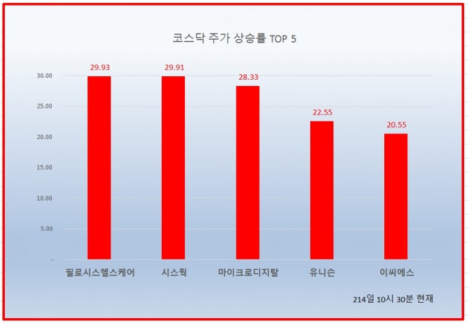 1위 필로시스헬스케어 4905원 ( 29.93% ), 2위 시스웍 7470원 ( 29.91% ), 3위 마이크로디지탈 18800원 ( 28.33% ), 4위 유니슨 3125원 ( 22.55% ), 5위 이씨에스 5750원 ( 20.55% ), 6위 이퓨쳐 7640원 ( 19.75% ), 7위 제넨바이오 4570원 ( 17.63% ), 8위 시노펙스 5720원 ( 17.57% ), 9위 링네트 6520원 ( 14.39% ), 10위 셀레믹스 29600원 ( 14.73% ),