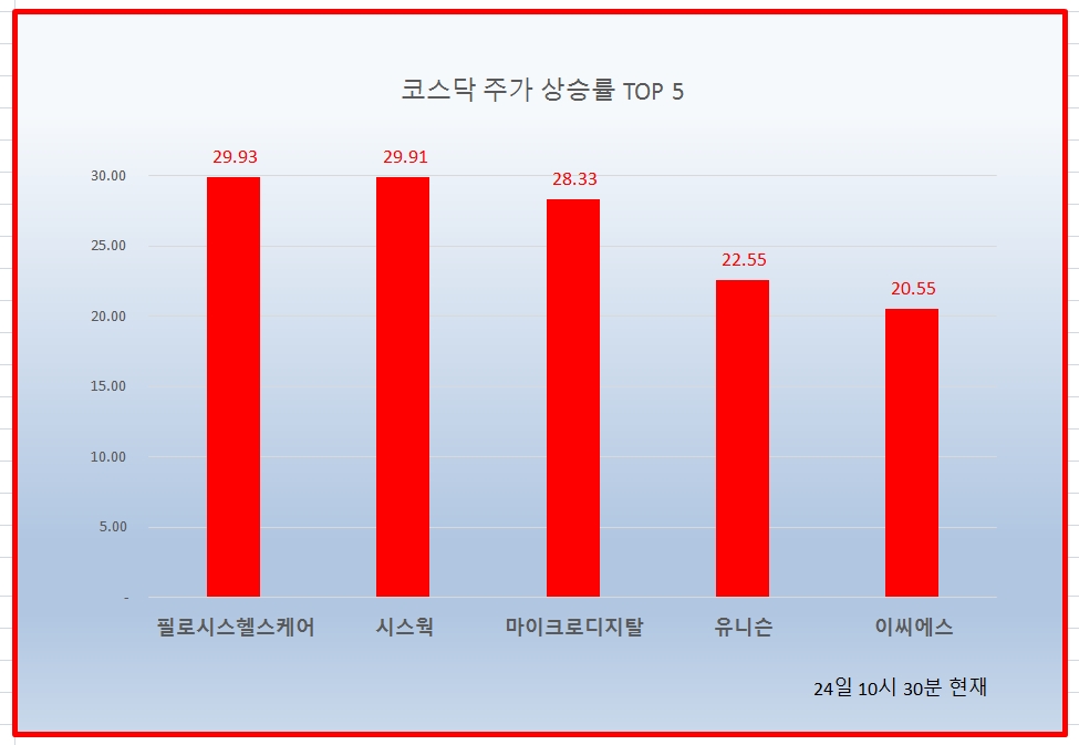 24일 10시 30분 현재 코스닥 상승률 상위 50개 종목은 다음과 같다.