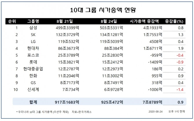 이미지 확대보기글로벌이코노믹이 24일 오후 1시 기준으로 집계한 결과, 국내 10대 그룹(공정위 발표기준, 농협 제외)의 시가총액은 이날 하루 7조8789억 원이 증가하며 증시 반등을 이끌고 있다.